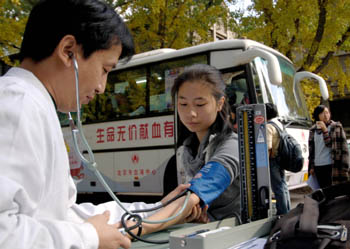 北大學子無償獻血應對“血荒”。10月31日,北京大學校園內,剛滿18歲的學生韓旭測量血壓準備獻血。 新華社發(趙琬微/攝) |