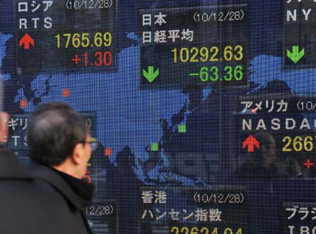 12月28日,在日本東京,一名行人從股市信息顯示屏前走過。當日,受獲利了結等因素影響,東京股市日經225種股票平均價格指數下跌63.36點,收于10292.63點,跌幅0.61%。