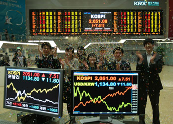 2010年12月30日,韓國首爾一家股市交易所內(nèi),工作人員們慶祝股市大漲。當(dāng)日,韓國綜合股指突破2050點(diǎn)大關(guān),再創(chuàng)全年新高。新華社發(fā) 樸真熙