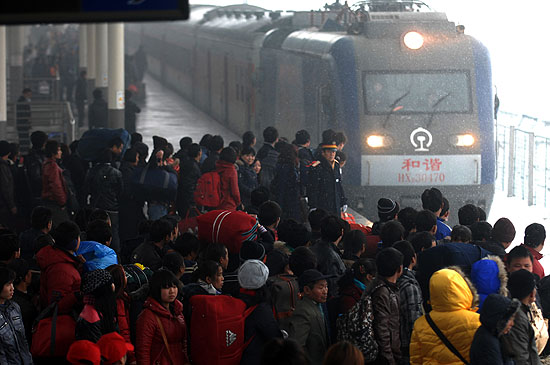 | 2011年1月19日,杭州火車站南站,旅客在站臺等待列車進站。記者 黃宗治/攝 |