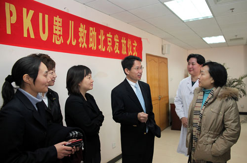 2011年1月30日,衛生部婦幼保健與社區衛生司兒童處處長曹彬(右一)在活動儀式上與美贊臣營養品(中國)有限公司華北區總經理陳國憫(右三)交流。當日,國內首個以援助苯丙酮尿癥(簡稱PKU)孩子為宗旨的“希望花開基金”PKU患兒救助發放儀式在北京婦幼保健院舉行。據介紹,苯丙酮尿癥是一種先天性代謝疾病,可引起大腦及神經系統損傷,為了免受智力損傷,PKU患者必須終生進食人工合成的特殊事物,大部分PKU家庭因此陷入經濟與精神的雙重困境。“希望花開基金”的成立以及在全國開展的“希望花開,愛捐行動”,旨在呼吁更多人一起關注這個群體,并且給PKU孩子和家庭提供持續的援助。