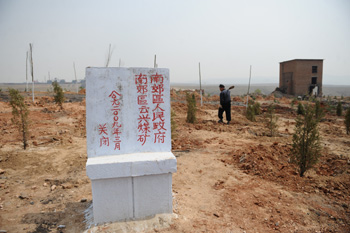 在山西省大同市南郊區一處被淘汰關停的小煤礦,一名工人正在護理新種的樹苗。記者 燕雁