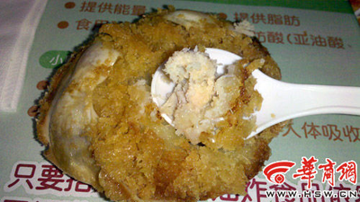 廣告很誘人,但消費卻讓人失望,說不出是什么味,但能肯定絕對不是蟹肉。” 隨后記者購買了一只”黃金蟹斗”,聞起來也是一股刺鼻的味道,吃在嘴里感覺是魚肉蟹肉淀粉混合體,口感一般,但也并未發(fā)現(xiàn)有魚骨魚刺。