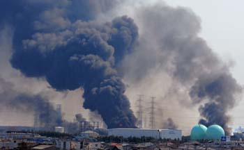 3月13日,滾滾濃煙從日本宮城縣多賀城的工業建筑物內冒出。新華社/法新 |