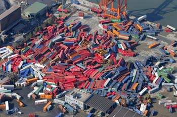3月12日在日本仙臺港口上空拍攝的地震后散落的集裝箱。新華社/美聯 |