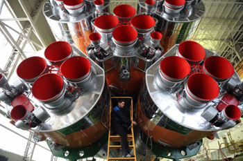 2010年12月12日,在哈薩克斯坦境內的拜科努爾發射場拍攝的俄羅斯聯盟TMA-20飛船運載火箭的組裝線。新華社發 |