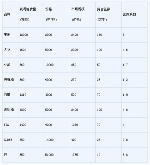表5 國內現有典型品種的市場數據與持倉基數對照