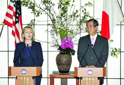 圖為日本外相松本剛明(右)與到訪的美國(guó)國(guó)務(wù)卿希拉里·克林頓當(dāng)天在東京舉行聯(lián)合記者發(fā)布會(huì)。