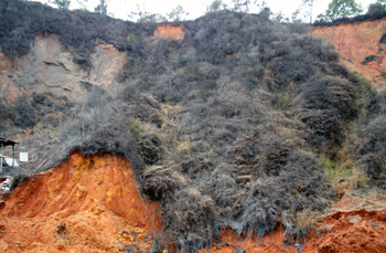 一家非法鋁灰廠背后的山體植被呈現(xiàn)可怕的灰黑色。記者 劉大江/攝 |