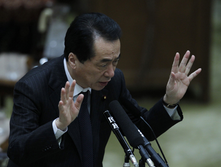 據共同社報道,日本首相菅直人4月25日在參議院決算委員會議上表示,地震災后重建“需要相當規模的財政投入”,他說,“為了全面災后重建,我們將討論2011年財年第二個追加預算案,并同時制定出財政整頓方案。” 菅直人和其他內閣成員說,政府最有可能通過發行新的債券來為第二個追加預算案籌資。這將進一步擴大日本業已龐大的債務規模。 圖為日本首相菅直人25日在東京參議院決算委員會議上回答立法委員的提問。