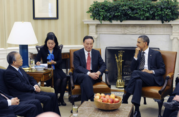 5月9日,美國總統奧巴馬在華盛頓白宮會見正在當地出席第三輪中美戰略與經濟對話的中國國家主席胡錦濤特別代表國務院副總理王岐山、國務委員戴秉國。新華社記者