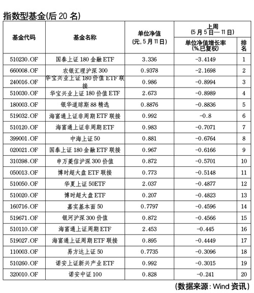國泰基金管理有限公司旗下的,2011年3月底設立的的國泰上證180金融ETF以-3.41%的凈值增長率成為本周(5月5日-11日)指數型基金收益倒數第一,其今年以來年漲幅為-4.1%。