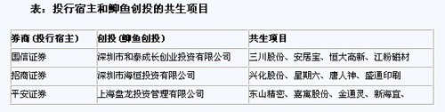 券商投行部門與創投機構之間形成“宿主”與“印魚”關系的,以國信證券、招商證券和平安證券為代表,而這三家券商共同的特點是,在創業板和中小板擴容大潮中占據了相當的IPO保薦項目市場份額。