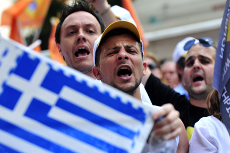 5月30日,在希臘雅典,希臘郵政銀行的雇員在憲法廣場議會大樓前集會,反對政府為應對債務危機而采取的緊縮措施。 日前,希臘政府提出新的財政緊縮措施,并計劃加快500億歐元的私有化進程,以力爭實現(xiàn)2011年的減赤目標,從而順利獲得歐盟和IMF的援助貸款。但這些計劃遭到反對黨強烈抵制。帕潘德里歐警告說,如果不能盡快拿到貸款,希臘極可能走向破產(chǎn)。