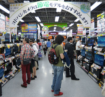 6月9日,在東京秋葉原的淀橋相機連鎖百貨店(Yodobashi Camera)里的專賣電視的商場。 由于日本福島第一核電站事故以及其后續效應所導致的日本全國大范圍的電力供應緊張,日本廠商和家電賣場積極推廣節能電力的空調,電風扇,LED燈等家用電器。