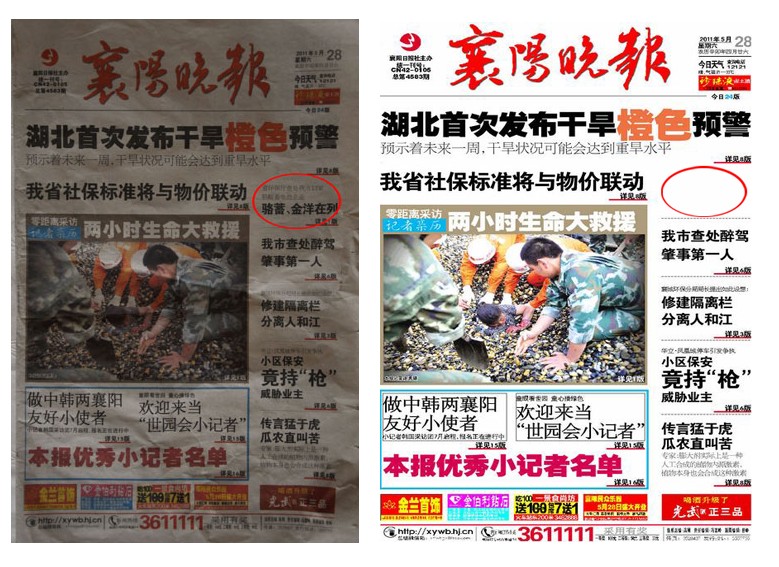 | 左圖為當日紙質的《襄陽晚報》,右圖為被篡改后的電子版 |