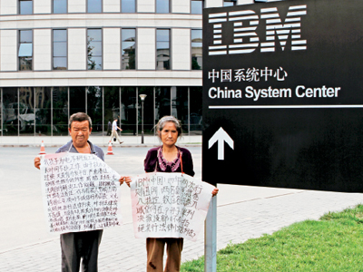 炎炎烈日將地面烤得發燙,老人卻毫不懈怠地守護著鋪在大廈臺階上的幾張發黃的硬殼紙,紙上布滿了密密麻麻的文字,字跡顯得有些凌亂不清,但從中卻似乎能感受到一種憤懣的情緒,尤其是“IBM”三個字力透紙背。