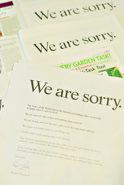 據(jù)路透社17日消息,默多克新聞集團(tuán)下屬新聞國(guó)際前首席執(zhí)行官麗貝卡·布魯克斯因竊聽丑聞被英國(guó)警方逮捕,清查仍在繼續(xù)。而默多克最新公開的道歉信也未能平民怨,英國(guó)的執(zhí)政黨和在野黨都不滿意他的道歉,希望把新聞集團(tuán)徹底趕出英國(guó)。 上圖為布魯克斯(右)和默多克。下圖為16日英國(guó)各大報(bào)紙當(dāng)天刊登該道歉信。