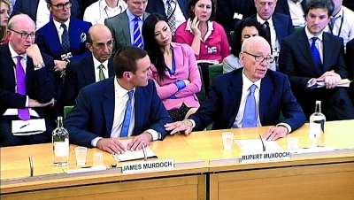 北京時(shí)間19日晚9點(diǎn)半,就電話竊聽丑聞,新聞集團(tuán)總裁默多克(右)和兒子詹姆斯接受英國議會(huì)下院“文化媒體和體育委員會(huì)”的聽證質(zhì)詢。聽證會(huì)一開始,詹姆斯就希望先進(jìn)行一次陳述,但被委員會(huì)主席約翰·廷戴爾拒絕了。默多克接過兒子的話說:“這是我人生中最卑微的一天。”