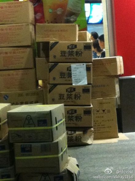 圖為網友曝出的肯德基門店外堆放著幾箱豆漿粉原料。(來源:網友微博上傳) |