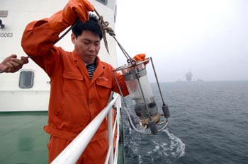 蓬萊19-3漏油事故發生后,國家海洋局北海環境監測中心工作人員在用深層采水器采中層、底層水水樣。記者