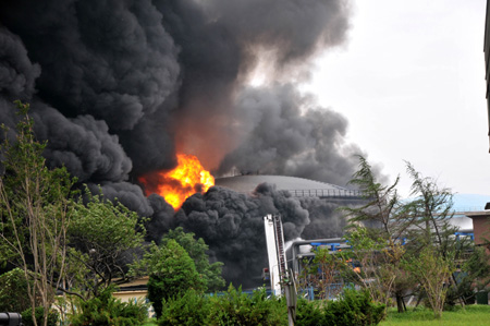 圖為火災現場(8月29日攝)。 29日上午10時左右,中石油大連石化分公司油品罐區一個可存儲數千噸柴油的罐體突然發生火災,到13時20分左右,火災基本被撲滅,未造成人員傷亡。起火原因正在調查中。這是自2010年7月16日以來,中石油在大連發生的至少第四次火災事故。