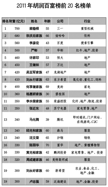 9月7日,胡潤研究院發(fā)布《2011雅居樂海南清水灣胡潤百富榜》的前50名,這是胡潤研究院自1999年以來第十三年發(fā)布“胡潤百富榜”,從這些富豪的排名的起起落落中,自2008年金融危機(jī)以來中國各行業(yè)的興衰起伏可窺見一斑。