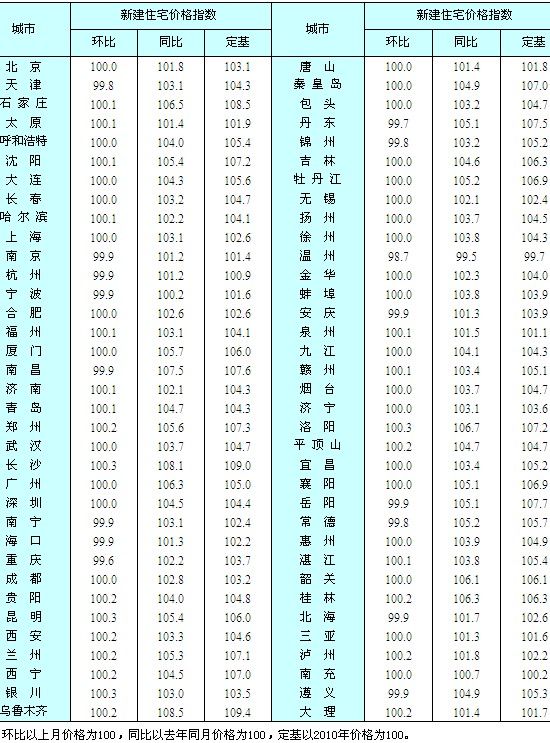 3、2011年9月份,68個城市的新建住宅價格指數根據網簽數據計算,其他2個城市根據統計系統房地產開發統計報表中各個項目的分類銷售面積和金額數據計算。68個網簽數據城市分別是:北京、天津、石家莊、太原、呼和浩特、沈陽、大連、長春、哈爾濱、上海、南京、杭州、寧波、合肥、福州、廈門、南昌、濟南、青島、鄭州、武漢、長沙、廣州、深圳、南寧、海口、重慶、成都、貴陽、昆明、西安、蘭州、西寧、銀川、烏魯木齊、唐山、秦皇島、包頭、丹東、吉林、牡丹江、無錫、揚州、徐州、溫州、金華、蚌埠、安慶、泉州、九江、贛州、煙臺、濟寧、洛陽、平頂山、宜昌、襄陽、岳陽、常德、惠州、湛江、韶關、桂林、北海、三亞、瀘州、南充、大理。9月份新增加的城市是唐山、贛州、大理。