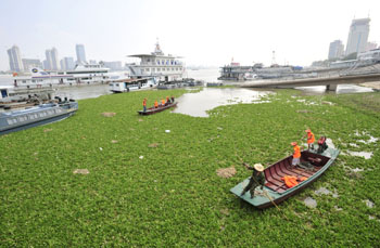 圖為8月29日武漢水上管理處清漂隊員在長江武漢段打撈水葫蘆。當時,密密麻麻的水葫蘆綿延達數十公里。新華社發(葉火生/攝) |