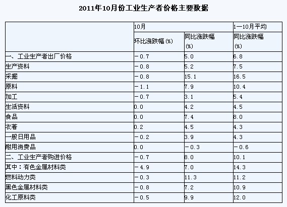 2011年10月份,全國工業生產者出廠價格比上月下降0.7%,比去年同月上漲5.0%。工業生產者購進價格比上月下降0.7%,比去年同月上漲8.0%。2011年1—10月,工業生產者出廠價格平均同比上漲6.8%,工業生產者購進價格平均同比上漲10.1%。