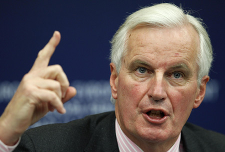 11月15日,在法國斯特拉斯堡,歐盟委員會負責內部市場與服務的委員米歇爾·巴尼耶出席新聞發布會介紹針對信用評級機構的新提案。 歐盟委員會15日就加強信用評級機構監管推出一項提案,要求評級機構遵循更加嚴厲的法規,其評級更加透明,并對犯下的錯誤承擔責任。