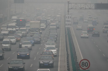 霧霾天里,汽車行駛在北京京開高速路上。資料照片 |