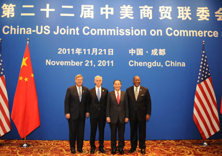 中國和美國21日在成都簽署了涉及知識產(chǎn)權(quán)、高技術(shù)、貿(mào)易統(tǒng)計(jì)、能源、企業(yè)合作對接等5個(gè)經(jīng)貿(mào)合作文件。第22屆中美商貿(mào)聯(lián)委會會議當(dāng)日于此間舉行,國務(wù)院副總理王岐山與美國商務(wù)部長布賴森、貿(mào)易代表柯克共同主持會議,美國農(nóng)業(yè)部長維爾薩克與會。會議后,雙方舉行了有關(guān)協(xié)議的簽字儀式。