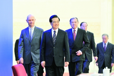 圖為國家主席胡錦濤同中外嘉賓一起步入會場。