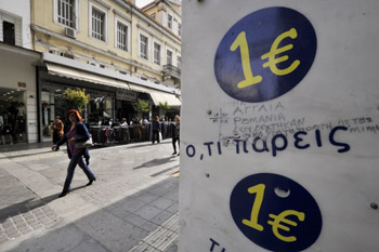 在希臘雅典街頭,一名婦女走過一家“一歐元”商店。新華社發 |