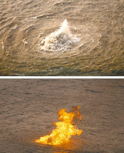 | 上圖:12月19日,泄漏的天然氣推動(dòng)海水形成水柱。下圖:12月20日,為防止管線爆炸,珠海有關(guān)部門在海面泄漏點(diǎn)點(diǎn)燃天然氣。新華社發(fā) |