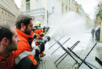 12月22日,在比利時布魯塞爾,比利時消防員在副首相兼養老金大臣文森特·范奎肯伯恩的辦公室附近打開消防水槍噴泡沫,抗議議會即將討論的退休金制度改革法案。