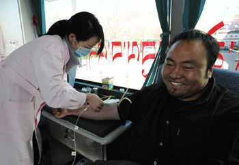 近期,受季節(jié)性供血規(guī)律影響,西藏拉薩中心血庫(kù)告急,截至2月6日庫(kù)存量?jī)H有63袋。據(jù)拉薩市血液中心負(fù)責(zé)人介紹,拉薩市一直處于用血緊張的狀態(tài),近期更是出現(xiàn)嚴(yán)重短缺,目前血庫(kù)中各種血型均出現(xiàn)大量短缺,其中AB型血短缺最為嚴(yán)重,僅為6袋。圖為2月6日,一位藏族青年在拉薩市的流動(dòng)采血車(chē)?yán)镞M(jìn)行無(wú)償獻(xiàn)血。記者