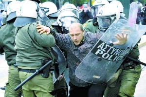 希臘媒體報(bào)道說,聚集在憲法廣場(chǎng)的示威者約有2.5萬人。記者在現(xiàn)場(chǎng)看到,當(dāng)?shù)貢r(shí)間下午5時(shí)30分左右,部分示威者向警察投擲石塊、汽油彈、礦泉水瓶、橘子和咖啡杯等,警察發(fā)射催淚彈并揮舞警棍驅(qū)散示威者。
