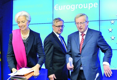 2月21日,在比利時首都布魯塞爾的歐盟總部,國際貨幣基金組織總裁拉加德、歐盟委員會負責經濟與貨幣事務的委員雷恩和歐元集團主席、盧森堡首相容克(左至右)出席歐元區財長會議后的記者招待會。