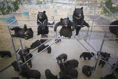 歸真堂的黑熊散養區內有五、六十只幼年黑熊在活動。散養區后方,是一排排的熊舍。據了解,這個生物園共有六百多頭黑熊。黑熊要三歲以上才可引膽汁,眼前這幾十頭還屬幼熊,尚未取過膽汁。