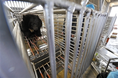 在兩名講解員的講解下,三名引流員開始演示引膽過程。工作人員先用酒精棉擦拭瘺孔,再用一根長約八厘米的中空引流針插入熊腹部位置。大約一百毫升的暗黃色熊膽汁隨即流出。整個引流過程時長不足一分鐘,其間黑熊體態平靜,一直在進食。由于熊舍內光線昏暗,并且不允許打開閃光燈拍攝,無法觀察到黑熊造瘺取膽的部位。從室外遠處看,只能辨識取膽熊腹部毛發被剔除,裸露出肉色。按照歸真堂相關規定,手術環節并不對外開放。 昨日,歸真堂開放其養熊基地,一百多名來自各地的記者受邀進入熊場,目睹“活熊取膽”全過程。這是歸真堂熊場第一個公開日,也是養熊行業首度對外開放。假山、噴泉、盆栽,以及“天人合一”的牌匾,這是福建歸真堂生物發展有限公司大門口的景象。很難將其與園中的數百頭困獸聯系起來。目前,該公司已建成生產區、放養區、繁殖區三大區域,而保健區、醫療區還在后期籌建當中。歸真堂演示的活熊取膽過程,引流取膽時長不足一分鐘。記者參觀時間約兩小時。 一些受邀人士對歸真堂開放日“態度冷淡”。著名環保人士、大自然保護協會北亞區總干事長張醒生明確表示“不會參加”,“歸真堂不和簽名者交流就直接公開邀請,除作秀外,你還想做什么?”另一位民間動物保護人士張丹告訴記者,她還在猶豫。“歸真堂開放養熊場是一次很好的機會,但僅有兩天的開放時間究竟能看到些什么呢?”她擔心的是“眼見不一定為實”。而就在昨日,AAF(亞洲動物基金)已因為參觀熊場受阻等原因,宣布停止原參觀計劃。