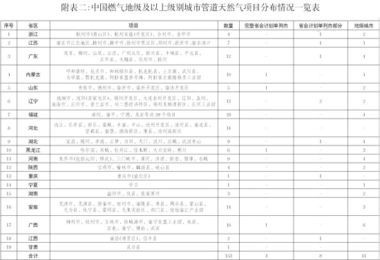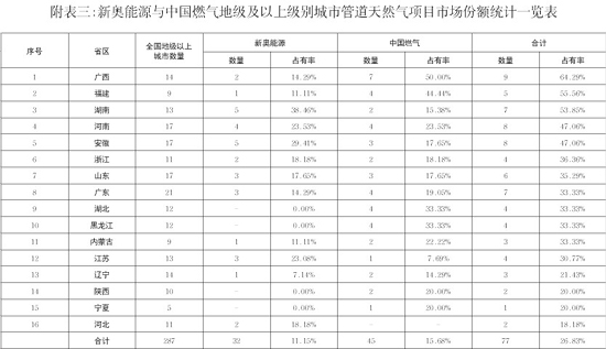 (2)全國地級及以上級別城市287個(包括直轄市、省會城市、計劃單列市),兩公司合計擁有77個城市的管道天然氣項目(尚未考慮新奧擁有的6個省會城市部分區域項目和中國燃氣擁有的8個省會城市部分區域項目),兩公司合計擁有地級以上城市項目占全國地級以上城市的26.83%。其中在廣西、福建、湖南,兩公司合計擁有地級以上項目數量超過當地總項目數50%,在河南、安徽、浙江、山東、廣東、湖北、黑龍江、內蒙古、江蘇超過30%,在其他3個省份則超過20%。有關項目的較詳細情況請見本文后附表。