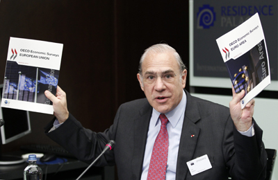 圖為經合組織秘書長葛利亞出席在布魯塞爾舉行的新聞發布會。