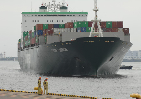 4月19日,在日本東京大井集裝箱碼頭,工作人員在等待貨輪停靠。 日本財(cái)務(wù)省19日公布的貿(mào)易速報(bào)數(shù)據(jù)顯示,受能源進(jìn)口大幅增加等影響,今年3月份日本出現(xiàn)826億日元(約合10億美元)貿(mào)易逆差。數(shù)據(jù)顯示,3月份日本出口額為6.2042萬(wàn)億日元(約合764億美元),同比增長(zhǎng)5.9%,是六個(gè)月來(lái)首現(xiàn)同比增長(zhǎng),其中汽車及零部件、建筑和采礦機(jī)械等出口增幅明顯。