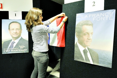 法國總統(tǒng)選舉第二輪投票6日全面展開,現(xiàn)任總統(tǒng)薩科齊和左翼社會黨候選人奧朗德為下一屆總統(tǒng)職位展開最后角逐。法國本土投票站最晚于當(dāng)晚20時(北京時間7日凌晨2時)關(guān)閉,據(jù)悉此后不久即公布初步統(tǒng)計(jì)結(jié)果。 奧朗德主張尋求變革,回應(yīng)選民有關(guān)失業(yè)、購買力、安全等一系列問題的擔(dān)憂,并承諾將引導(dǎo)歐洲重返加速增長和擴(kuò)大就業(yè)的道路。而代表右翼保守勢力的薩科齊主打緊縮、增稅和保護(hù)主義牌。 圖為一名工作人員在澳大利亞悉尼市法語聯(lián)盟語言學(xué)校中設(shè)立的海外投票站點(diǎn)布置會場。