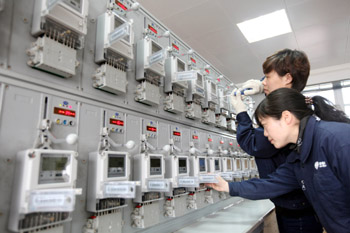國(guó)家電網(wǎng)安徽蚌埠供電公司員工校驗(yàn)智能電表,為即將試行的居民階梯電價(jià)做準(zhǔn)備。新華社發(fā)(牛路/攝) |