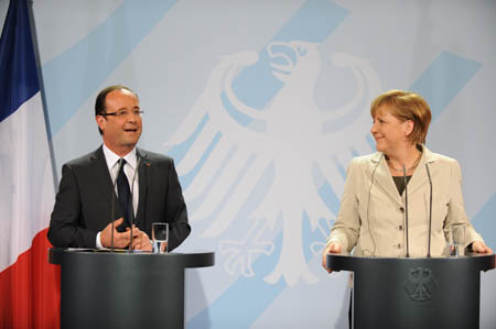 5月15日,德國總理默克爾(右)與來訪的法國新任總統奧朗德在柏林一同出席新聞發布會。 德國總理默克爾15日在柏林總理府與當天剛剛就任法國總統的奧朗德舉行首次會晤。雙方承諾將合作克服分歧,尋找推動歐洲增長之路,同時表示希望希臘留在歐元區,并將為此提供幫助。