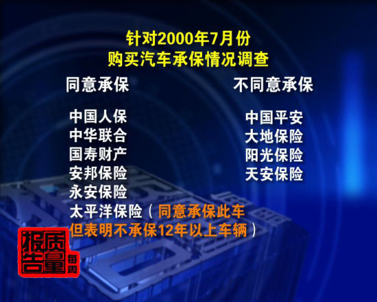 事實真的如此嗎?記者在江蘇對2011年我國財產(chǎn)險公司中,業(yè)務收入排名前十位的保險公司進行了調(diào)查。結果,針對這輛2000年7月購買的小汽車,五家保險公司同意對承保車損險,其中包括中國人保,中華聯(lián)合,國壽財產(chǎn),安邦保險和永安保險。太平洋保險表示可對此車承保,但不承保車齡在12年以上的車輛。其余四家保險公司不同意承保,包括中國平安,大地保險,陽光保險和天安保險。