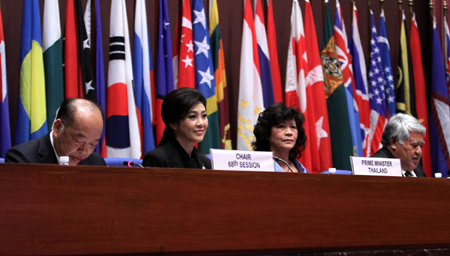 5月21日,聯合國亞洲及太平洋經濟社會委員會(簡稱亞太經社會)第68屆年會部長級會議在泰國曼谷開幕。 會議呼吁加強亞太地區經濟一體化,在不利的全球經濟背景下共同實現包容性可持續發展。 圖為泰國總理英拉(左二)出席亞太經社會第68屆年會部長級會議。